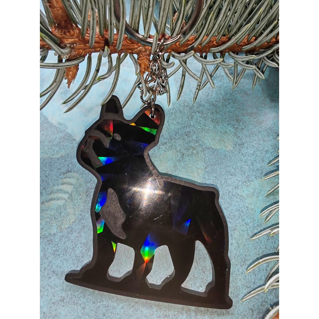 Krásný pejsek s holografickým efektem kdy každý přívěsek háže různé odlesky. Dejte vašim klíčům, nebo třeba batohu nový vkusný prívěsek.