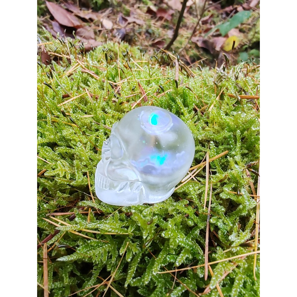Krásná průhledná lebka z kvalitní pryskyřice, s tekutým jádrem a fialovými hvězdičkami a srdíčky. Velikost cca 3cm x 2cm. Tvořeno pečlivě s láskou.Může obsahovat nějaké bublinky a nedokonalosti.