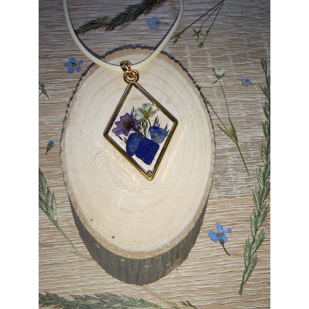 Nádherně propracovaný náhrdelník s pravými květy a  lazuritem, zalité v top pryskyřici. Kvalitní kov včetně řetízku. Krásný šperk který můžete mít stále při sobě a připomínat si tak spojení s přírodou, její klid, lásku a rozmanitost. Tvořeno s pečlivostí a láskou.