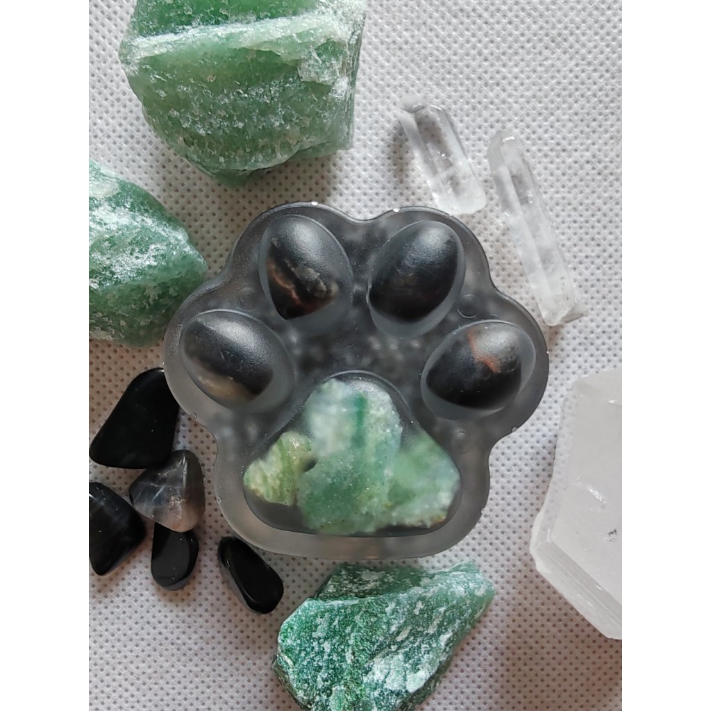 Tlapka z pryskyřice s obsidiánem, avanturínem a kovovými šponami. Může obsahovat nějaké bublinky a nedokonalosti. Tvořeno s láskou z kvalitní pryskyřice. Orgonit a jeho čistící schopnosti k sobě přitahuje elementární bytosti přírody. I proto platí, že "orgonit má rád dobré lidi", a pokud si k němu dokážeme najít osobní vztah, bude nám fungovat ještě lépe a více, očekává se od něj minimalizace negativních účinků okolí a zároveň přitahování energií pozitivních.