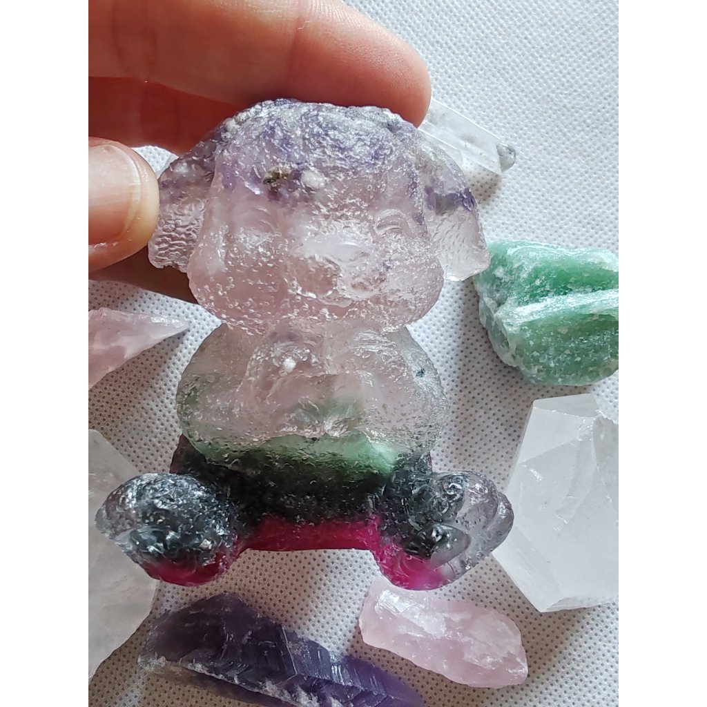 Zajíček z pryskyřice s ametystem, růženínem, křišťálem, avanturínem a kovovými šponami. Může obsahovat nějaké bublinky a nedokonalosti. Tvořeno s láskou z kvalitní pryskyřice. Orgonit a jeho čistící schopnosti k sobě přitahuje elementární bytosti přírody. I proto platí, že "orgonit má rád dobré lidi", a pokud si k němu dokážeme najít osobní vztah, bude nám fungovat ještě lépe a více, očekává se od něj minimalizace negativních účinků okolí a zároveň přitahování energií pozitivních.