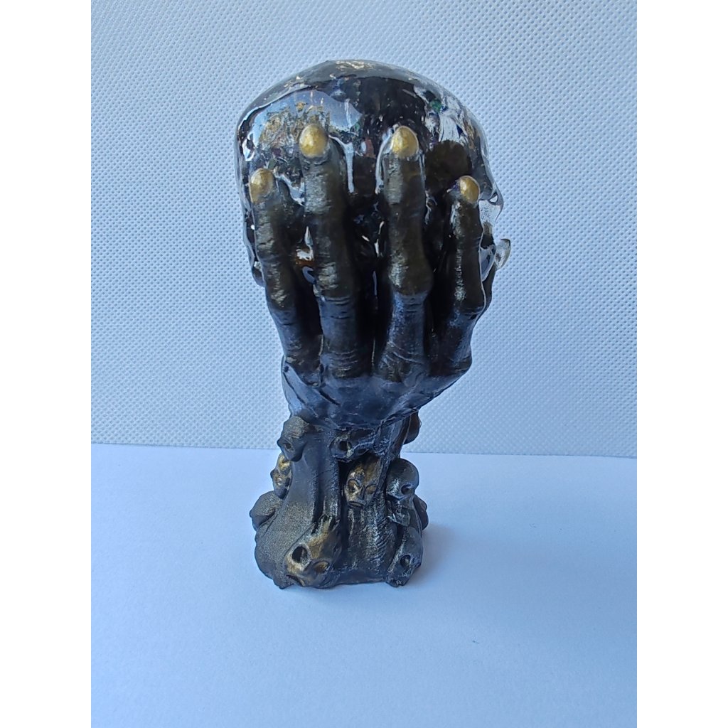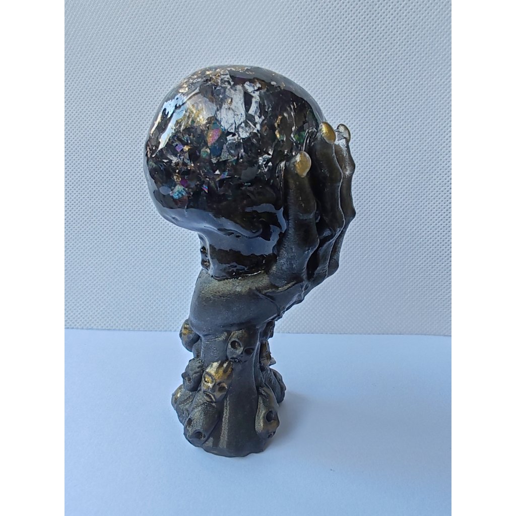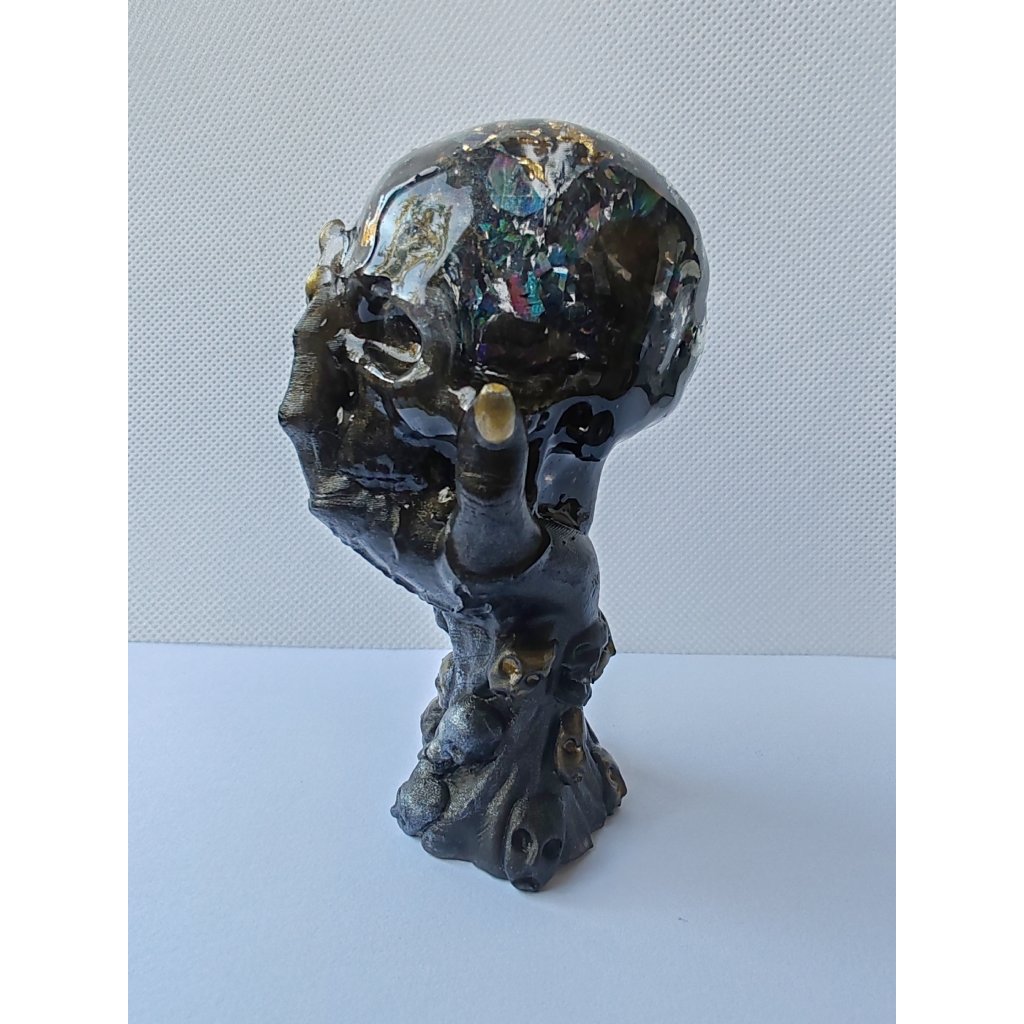 Krásná ruka zdobený pigmentem, z klasické pryskyřice v ruce je lebka s tekutým jádrem. Jádro je vytvořeno z tekutin a holografických kousíčků navíc ještě obsahuje černé třpytky.