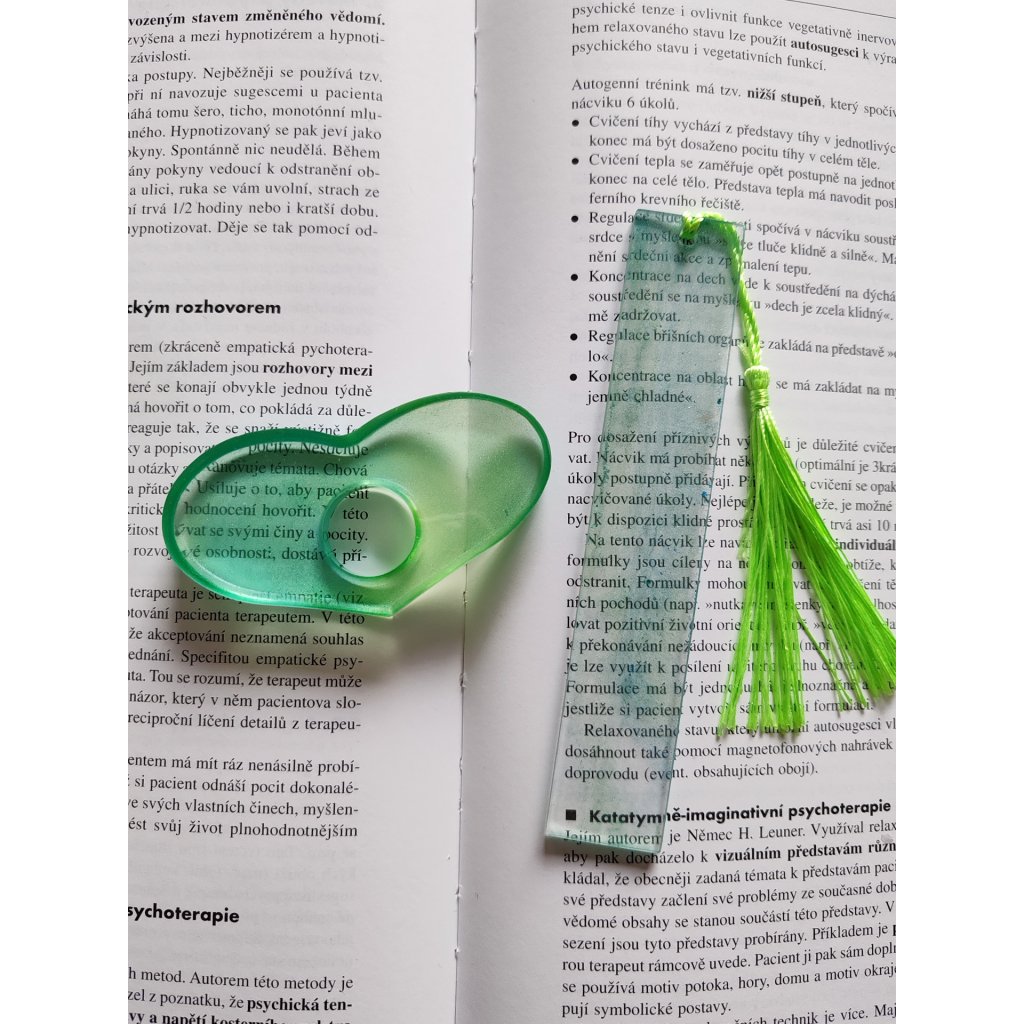 Záložka menší slouží do knihy pro krásné rozevření stránek při čtení, je zdobena pigmentem, stejně tak jako záložka do knihy která je velká 14 cm. Velikost na prst je 1,9 cm.