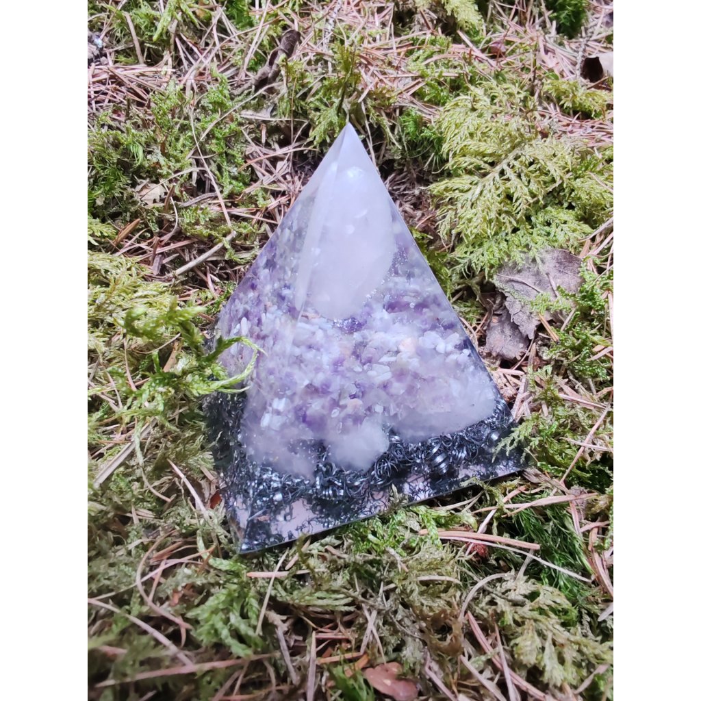 Střední pyramida z pryskyřice s růženínovým srdcem ,ametystem, růženíny a kovovými šponami. Může obsahovat nějaké bublinky a nedokonalosti. Tvořeno s láskou z kvalitní pryskyřice. Orgonit a jeho čistící schopnosti k sobě přitahuje elementární bytosti přírody. I proto platí, že "orgonit má rád dobré lidi", a pokud si k němu dokážeme najít osobní vztah, bude nám fungovat ještě lépe a více, očekává se od něj minimalizace negativních účinků okolí a zároveň přitahování energií pozitivních.