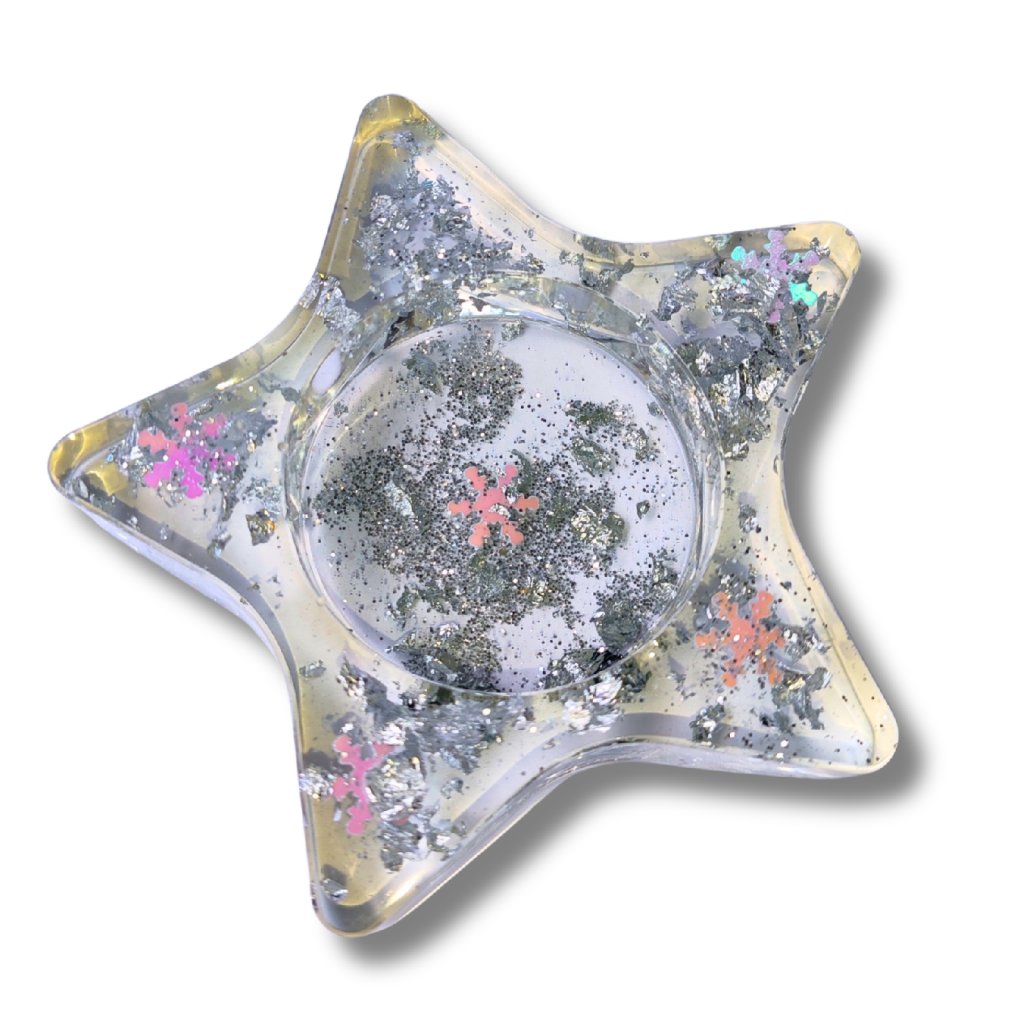 Krásný svícen vyroben z klasické pryskyřice která je velmi tvrdá . Svícen je zdoben stříbrnými kousíčky a vločkami, povrchově krásně lesklý, ale může obsahovat nějaké malé bublinky , vhodný na malé i velké čajové svíčky.